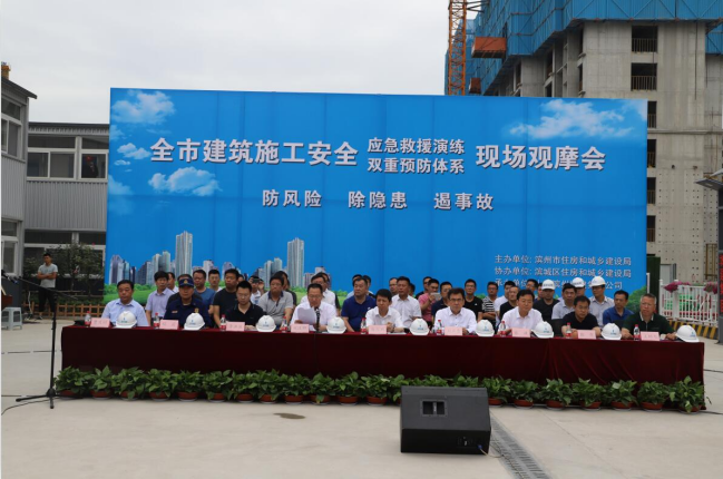 為落實開展好以“防風險、除隱患、遏事故”為主題的第十八個安全生產月活動,通過應急救援演練,及時有效的采取應急措施,減少事故二次傷害,提高全市建筑施工安全應急處置能力。濱州市住房和城鄉建設局5月30日上午在山東濱州城建集團公司黃河馨苑項目部施工現場,組織召開了全市建筑施工安全應急救援演練和雙重預防體系現場觀摩會。各縣(市、區)住建局分管局長、安監站長,全市房屋建筑總承包二級及以上施工企業分管負責人、市城區工程建設、監理、施工單位負責人,共計約350人參加了此次觀摩會。