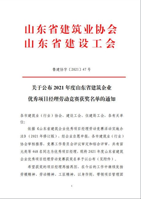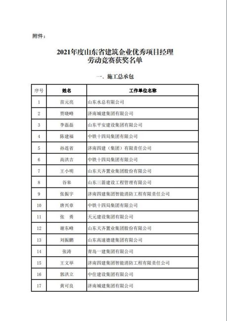 近日,省建筑業協會、省建設工會公布了2021年度山東省建筑企業優秀項目經理勞動競賽獲獎名單,城建集團孟玲輝、楊濤、梁雨生三人榮獲2021年度省級優秀項目經理榮譽稱號。